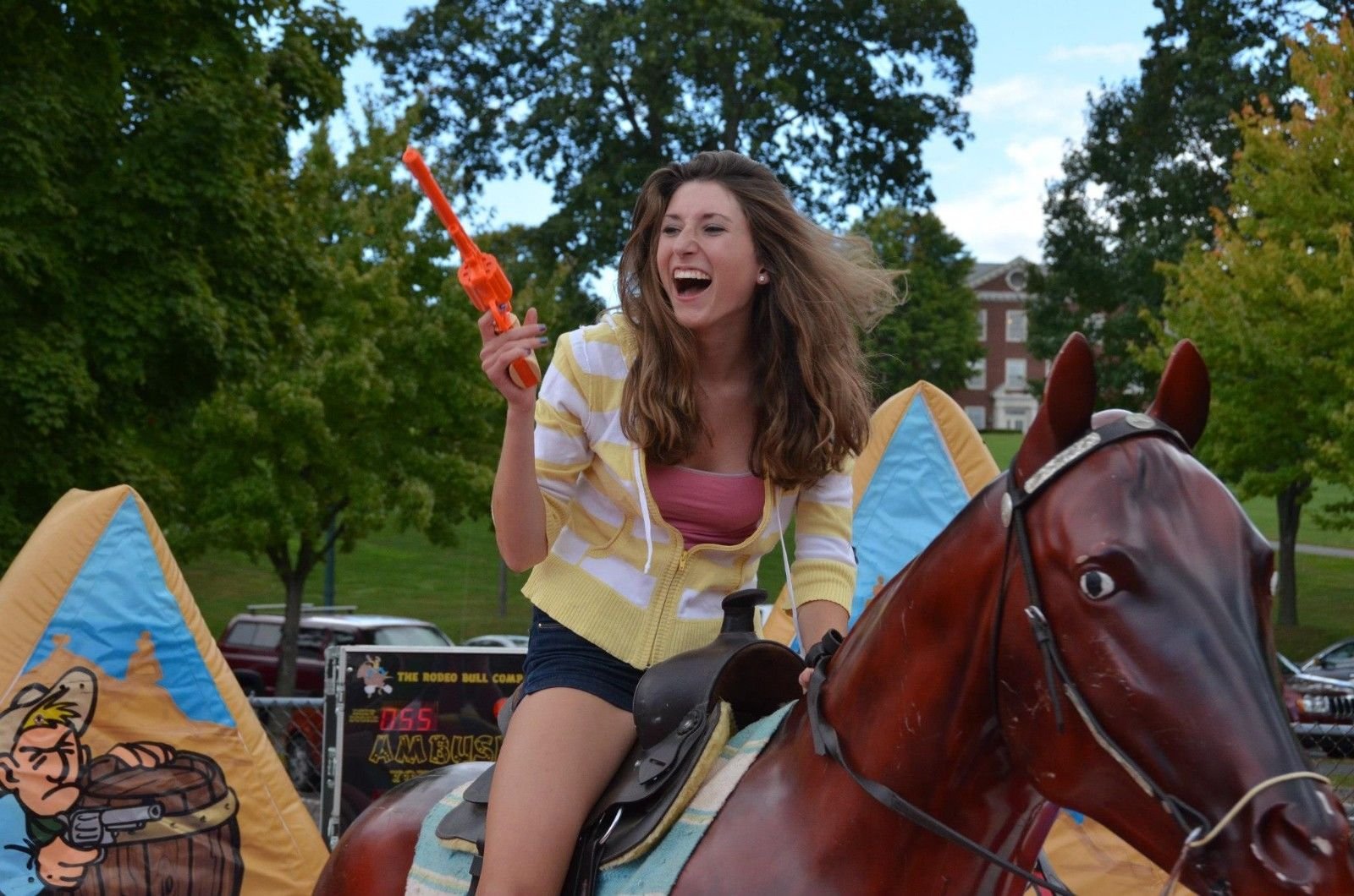 This is a very competitive game. GREAT FOR FUNDRAISERS. This is not a ride where the rider is meant to fall off or to be thrown off the horse. This game is meant that the players/riders just rides the horse as they are shooting the outlaws. This is a great add-on for any Western themed event.