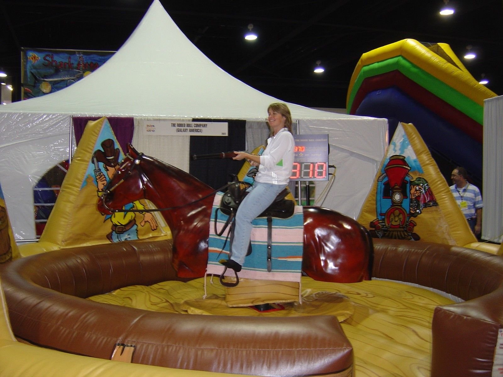 There are six inflatable outlaws that are set up around the back of the mechanical bull ring. Each outlaw has IR sensors going through each outlaw. To play the game a rider hops on the horse he chooses a replica rifle or pistol. The operator starts the horse moving slowly as the player shoots at the outlaws for one minute. There are six outlaws to shoot at. The red light on the GAore starts flashing when the time is up. The highest GAore is always showing on the GAoring unit as well as the GAore the player just got.
